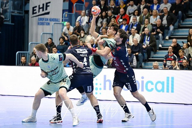 Julian Koester (VfL Gummersbach 7) gegen Johannes Golla (SG Flensburg-Handewitt, 4) unf Niclas Kirkeloekke (SG Flensburg-Handewitt,5) VfL Gummersbach vs. SG Flensburg-Handewitt, Handball, EHF Pokal, Hauptrunde, Spielzeit 2024-2025, Schwalbe Arena Gummersbach, 11.02.2025 Foto: Eibner-Pressefoto/Juergen Augst |