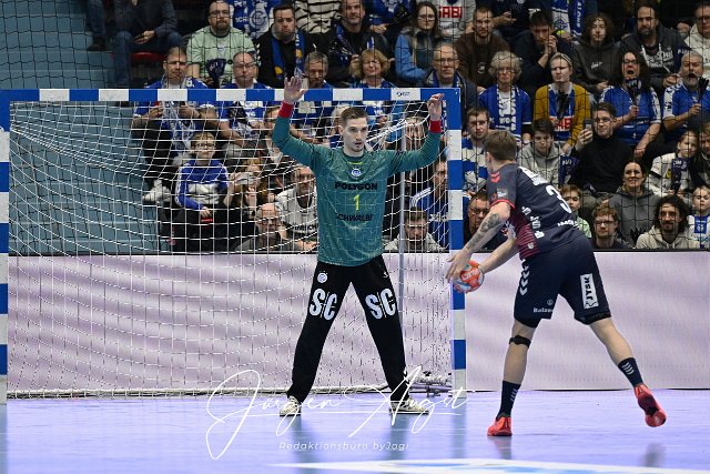 7 Meter Duell Dominik Kuzmanovic (VfL Gummersbach, 1) gegen Emil Jakobsen (SG Flensburg-Handewitt 31) VfL Gummersbach vs. SG Flensburg-Handewitt, Handball, EHF Pokal, Hauptrunde, Spielzeit 2024-2025, Schwalbe Arena Gummersbach, 11.02.2025 Foto: Eibner-Pressefoto/Juergen Augst |