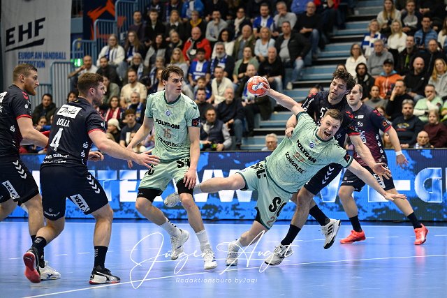 Kristjan Horzen (VfL Gummersbach, 27) setzt sich am Kreis gegennNiclas Kirkeloekke (SG Flensburg-Handewitt 5) durch VfL Gummersbach vs. SG Flensburg-Handewitt, Handball, EHF Pokal, Hauptrunde, Spielzeit 2024-2025, Schwalbe Arena Gummersbach, 11.02.2025 Foto: Eibner-Pressefoto/Juergen Augst |