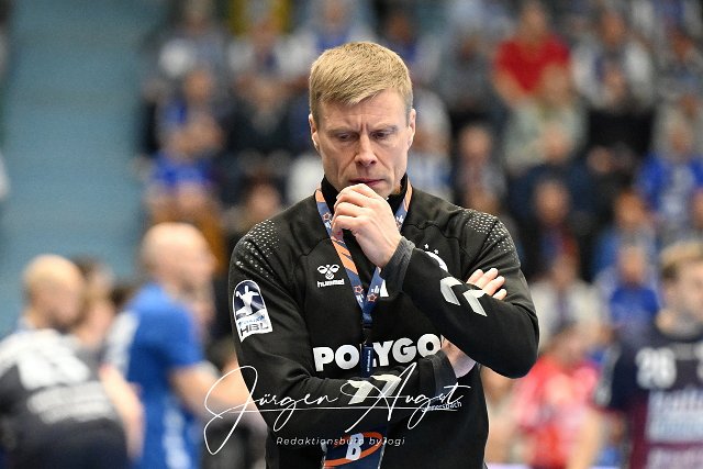 Gudjon Valur Sigurdsson (VfL Gummersbach, Trainer) blickt nachdenklich VfL Gummersbach vs. SG Flensburg-Handewitt, Handball, EHF Pokal, Hauptrunde, Spielzeit 2024-2025, Schwalbe Arena Gummersbach, 11.02.2025 Foto: Eibner-Pressefoto/Juergen Augst |