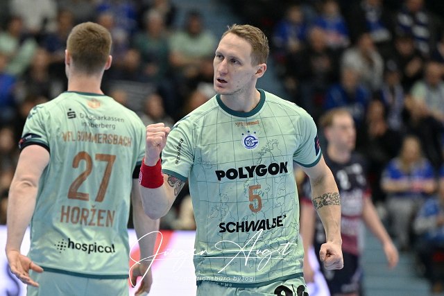 Tilen Kodrin (VfL Gummersbach, 5) jubelt mit geballter Faust VfL Gummersbach vs. SG Flensburg-Handewitt, Handball, EHF Pokal, Hauptrunde, Spielzeit 2024-2025, Schwalbe Arena Gummersbach, 11.02.2025 Foto: Eibner-Pressefoto/Juergen Augst |