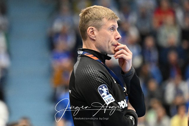 Gudjon Valur Sigurdsson (VfL Gummersbach Trainer) skeptisch VfL Gummersbach vs. SG Flensburg-Handewitt, Handball, EHF Pokal, Hauptrunde, Spielzeit 2024-2025, Schwalbe Arena Gummersbach, 11.02.2025 Foto: Eibner-Pressefoto/Juergen Augst |