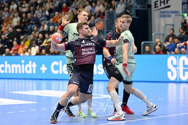 Am Kreis nur schwer zu halten Johannes Golla (SG Flensburg-Handewitt, 4) VfL Gummersbach vs. SG Flensburg-Handewitt, Handball, EHF Pokal, Hauptrunde, Spielzeit 2024-2025, Schwalbe Arena Gummersbach, 11.02.2025 Foto: Eibner-Pressefoto/Juergen Augst |