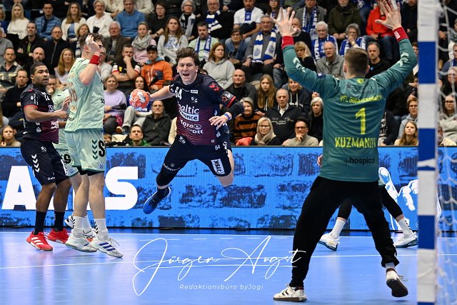 Lasse Kjaer Moeller (SG Flensburg-Handewitt, 64) gegen Dominik Kuzmanovic (VfL Gummersbach 1) VfL Gummersbach vs. SG Flensburg-Handewitt, Handball, EHF Pokal, Hauptrunde, Spielzeit 2024-2025, Schwalbe Arena Gummersbach, 11.02.2025 Foto: Eibner-Pressefoto/Juergen Augst |