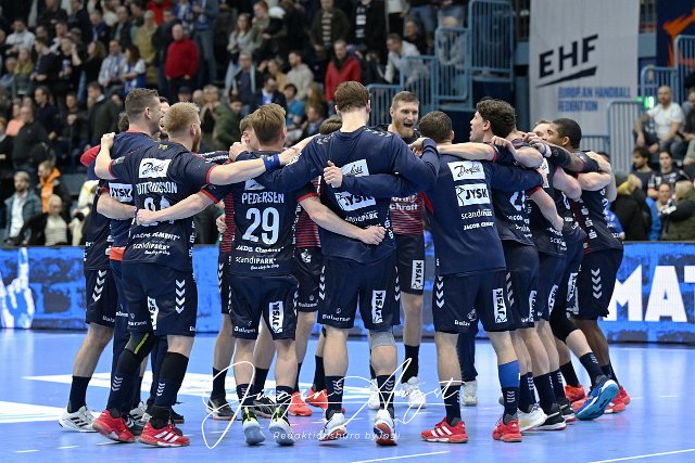 Die Spieler der SG Flensburg-Handwitt feiern den Sieg im EHF-Pokal ueber den VfL Gummersbach VfL Gummersbach vs. SG Flensburg-Handewitt, Handball, EHF Pokal, Hauptrunde, Spielzeit 2024-2025, Schwalbe Arena Gummersbach, 11.02.2025 Foto: Eibner-Pressefoto/Juergen Augst |