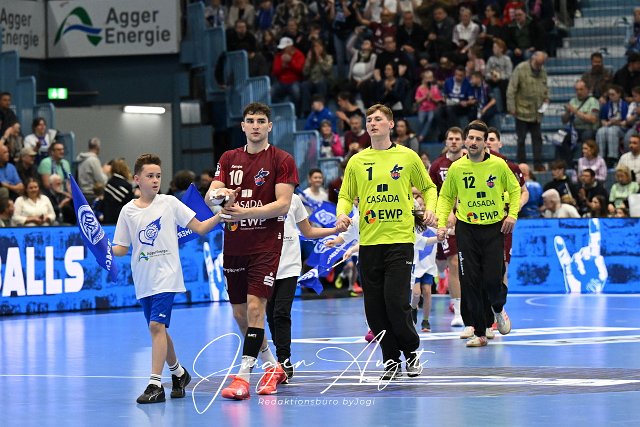 Die Mannschaft des 1. VfL Potsdam mit Kapitaen Elias Kofler (VfL Potsdam, 10) laeuft in die Schwalbe Arena in Gummersbach ein VfL Gummersbach vs. 1. VfL Potsdam, Handball, Daikin Handball Bundesliga, 27. Spieltag, Spielzeit 2024-2025, Schwalbe Arena, Gummersbach, 25.04.2025 Foto: Eibner-Pressefoto/Juergen Augst |