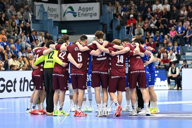 Die Mannschaften des VfL Gummersbach und des 1. VfL Potsdam versammeln sich vor dm Anwurf am Mittelkreis VfL Gummersbach vs. 1. VfL Potsdam, Handball, Daikin Handball Bundesliga, 27. Spieltag, Spielzeit 2024-2025, Schwalbe Arena, Gummersbach, 25.04.2025 Foto: Eibner-Pressefoto/Juergen Augst |