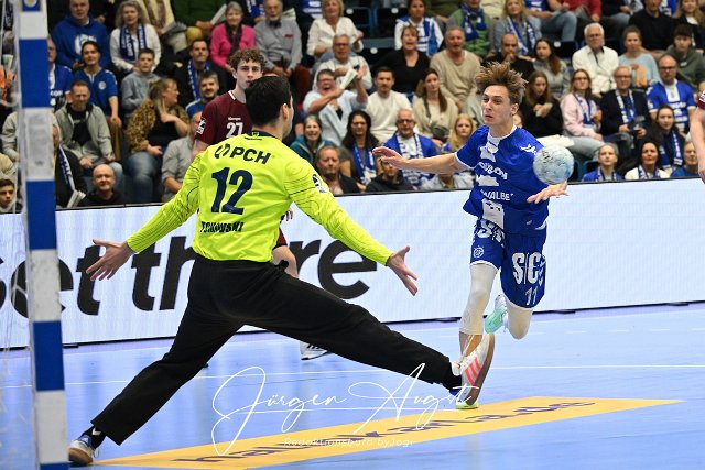 Mathis Haeseler (VfL Gummersbach 11) gegen Martin Tomovski (VfL Potsdam, 12) VfL Gummersbach vs. 1. VfL Potsdam, Handball, Daikin Handball Bundesliga, 27. Spieltag, Spielzeit 2024-2025, Schwalbe Arena, Gummersbach, 25.04.2025 Foto: Eibner-Pressefoto/Juergen Augst |