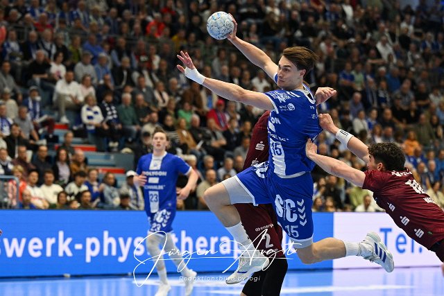 Miro Schluroff (VfL Gummersbach, 15) setzt sich gegen Elias Kofler (VfL Potsdam, 10) und Emil Hansson (VfL Potsdam, 2) durch VfL Gummersbach vs. 1. VfL Potsdam, Handball, Daikin Handball Bundesliga, 27. Spieltag, Spielzeit 2024-2025, Schwalbe Arena, Gummersbach, 25.04.2025 Foto: Eibner-Pressefoto/Juergen Augst |