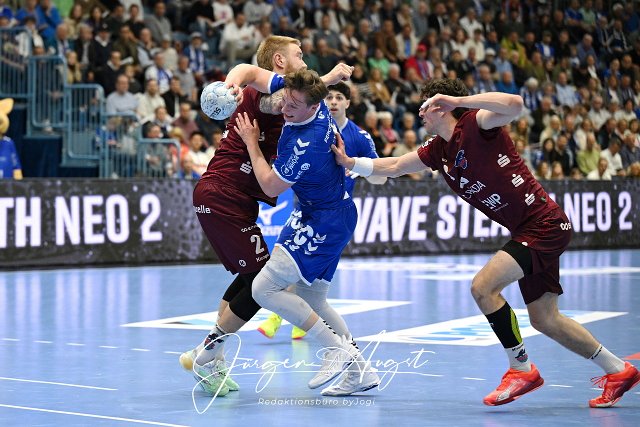 Ole Pregler (VfL Gummersbach 23) gegen Emil Hansson (VfL Potsdam, 2) und Elias Kofler (VfL Potsdam, 10) VfL Gummersbach vs. 1. VfL Potsdam, Handball, Daikin Handball Bundesliga, 27. Spieltag, Spielzeit 2024-2025, Schwalbe Arena, Gummersbach, 25.04.2025 Foto: Eibner-Pressefoto/Juergen Augst |
