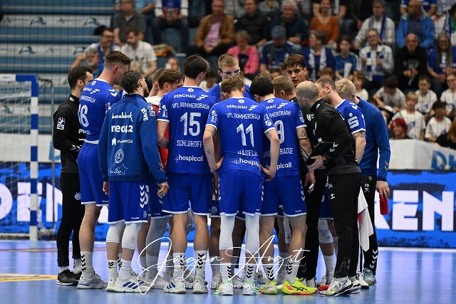 Der VfL Gummersbach konzentriert waehrend einer AUszeit VfL Gummersbach vs. 1. VfL Potsdam, Handball, Daikin Handball Bundesliga, 27. Spieltag, Spielzeit 2024-2025, Schwalbe Arena, Gummersbach, 25.04.2025 Foto: Eibner-Pressefoto/Juergen Augst |