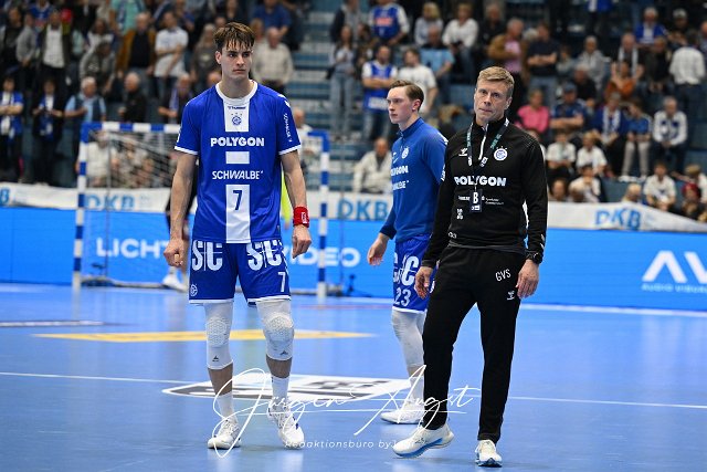Julian Koester (VfL Gummersbach, 7) und Gudjon Valur Sigurdsson (VfL Gummersbach, Trainer) unzufrieden VfL Gummersbach vs. 1. VfL Potsdam, Handball, Daikin Handball Bundesliga, 27. Spieltag, Spielzeit 2024-2025, Schwalbe Arena, Gummersbach, 25.04.2025 Foto: Eibner-Pressefoto/Juergen Augst |