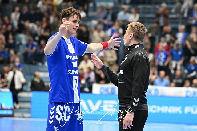 Julian Koester (VfL Gummersbach, 7) nd Gudjon Valur Sigurdsson (VfL Gummersbach, Trainer) VfL Gummersbach vs. 1. VfL Potsdam, Handball, Daikin Handball Bundesliga, 27. Spieltag, Spielzeit 2024-2025, Schwalbe Arena, Gummersbach, 25.04.2025 Foto: Eibner-Pressefoto/Juergen Augst |