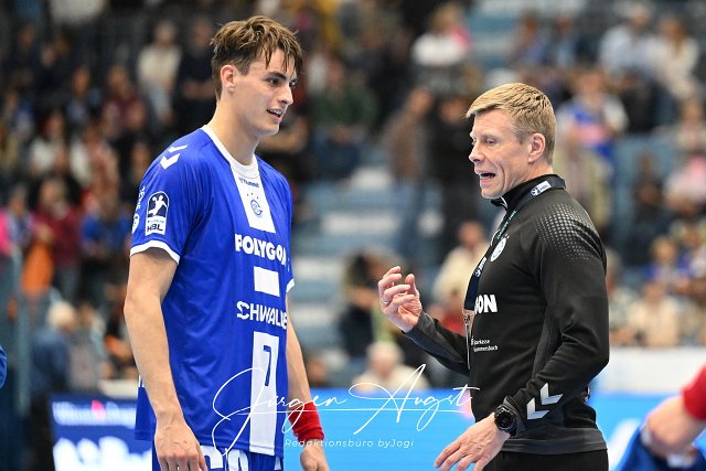 Julian Koester (VfL Gummersbach, 7) und Gudjon Valur Sigurdsson (VfL Gummersbach, Trainer) VfL Gummersbach vs. 1. VfL Potsdam, Handball, Daikin Handball Bundesliga, 27. Spieltag, Spielzeit 2024-2025, Schwalbe Arena, Gummersbach, 25.04.2025 Foto: Eibner-Pressefoto/Juergen Augst |