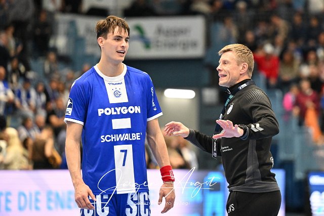 Gudjon Valur Sigurdsson (VfL Gummersbach Trainer) erklaert Julian Koester (VfL Gummersbach 7) einen Spielzug VfL Gummersbach vs. 1. VfL Potsdam, Handball, Daikin Handball Bundesliga, 27. Spieltag, Spielzeit 2024-2025, Schwalbe Arena, Gummersbach, 25.04.2025 Foto: Eibner-Pressefoto/Juergen Augst |