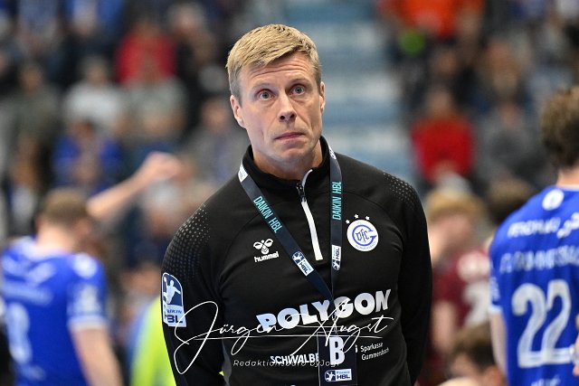 Gudjon Valur Sigurdsson (VfL Gummersbach, Trainer) blickt missmutig VfL Gummersbach vs. 1. VfL Potsdam, Handball, Daikin Handball Bundesliga, 27. Spieltag, Spielzeit 2024-2025, Schwalbe Arena, Gummersbach, 25.04.2025 Foto: Eibner-Pressefoto/Juergen Augst |