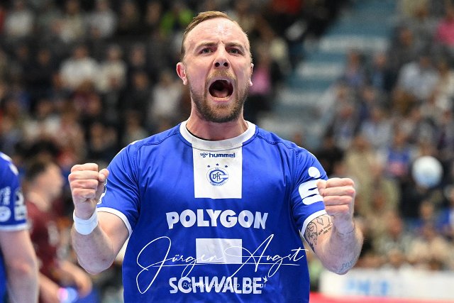 Lukas Blohme (VfL Gummersbach, 8) jubelt VfL Gummersbach vs. 1. VfL Potsdam, Handball, Daikin Handball Bundesliga, 27. Spieltag, Spielzeit 2024-2025, Schwalbe Arena, Gummersbach, 25.04.2025 Foto: Eibner-Pressefoto/Juergen Augst |