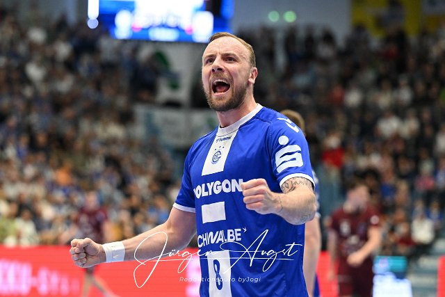 Lukas Blohme (VfL Gummersbach 8) jubelt VfL Gummersbach vs. 1. VfL Potsdam, Handball, Daikin Handball Bundesliga, 27. Spieltag, Spielzeit 2024-2025, Schwalbe Arena, Gummersbach, 25.04.2025 Foto: Eibner-Pressefoto/Juergen Augst |