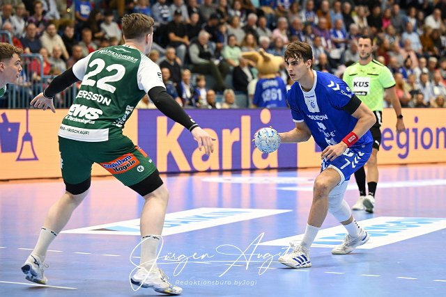 Julian Koester (VfL Gummersbach 7) im Angriff gegen Erik Persson (Frisch Auf Goeppingen 22) GER, VfL Gummersbach vs. FRISCH AUF Goeppingen, Handball, Daikin 1. Bundesliga, 31. Spieltag, Spielzeit 2024-2025, Schwalbe Arena Gummersbach, 28.05.2025 Foto: Eibner-Pressefoto/Juergen Augst |