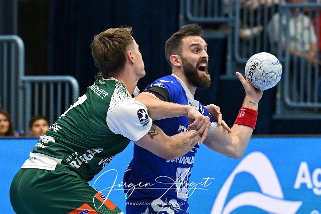 Teitur Einarsson (VfL Gummersbach 14) gegen Victor Kloeve (Frisch Auf Goeppingen 7) GER, VfL Gummersbach vs. FRISCH AUF Goeppingen, Handball, Daikin 1. Bundesliga, 31. Spieltag, Spielzeit 2024-2025, Schwalbe Arena Gummersbach, 28.05.2025 Foto: Eibner-Pressefoto/Juergen Augst |