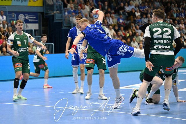 Ellidi Vidarsson (VfL Gummersbach 4) gegen Oskar Sunnefeldt (Frisch Auf Goeppingen 27) und Ymir Oern Gislason (Frisch Auf Goeppingen 33) sowie Erik Persson (Frisch Auf Goeppingen 22) GER, VfL Gummersbach vs. FRISCH AUF Goeppingen, Handball, Daikin 1. Bundesliga, 31. Spieltag, Spielzeit 2024-2025, Schwalbe Arena Gummersbach, 28.05.2025 Foto: Eibner-Pressefoto/Juergen Augst |