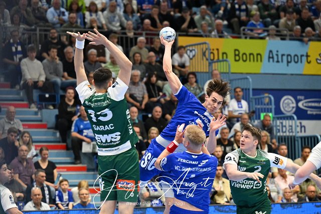 Miro Schluroff (VfL Gummersbach 15) gegen Josip Sarac (Frisch Auf Goeppingen 13) GER, VfL Gummersbach vs. FRISCH AUF Goeppingen, Handball, Daikin 1. Bundesliga, 31. Spieltag, Spielzeit 2024-2025, Schwalbe Arena Gummersbach, 28.05.2025 Foto: Eibner-Pressefoto/Juergen Augst |