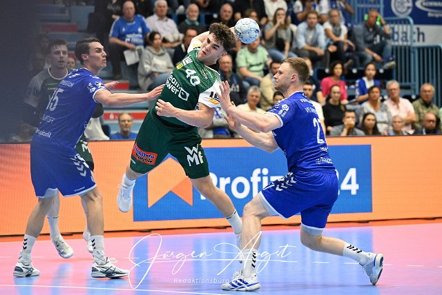 Elias Newel (Frisch Auf Goeppingen 40) gegen Miro Schluroff (VfL Gummersbach 15) und Kristjan Horzen (VfL Gummersbach 27 ) GER, VfL Gummersbach vs. FRISCH AUF Goeppingen, Handball, Daikin 1. Bundesliga, 31. Spieltag, Spielzeit 2024-2025, Schwalbe Arena Gummersbach, 28.05.2025 Foto: Eibner-Pressefoto/Juergen Augst |