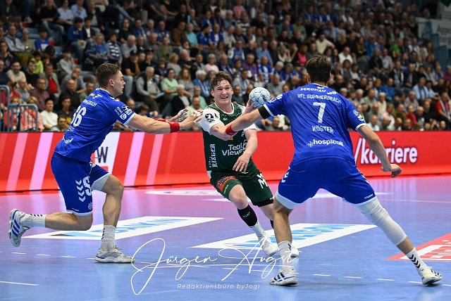Oskar Neudeck (Frisch Auf Goeppingen 2) gegen Stepan Zeman (VfL Gummersbach 66) und Julian Koester (VfL Gummersbach 7) GER, VfL Gummersbach vs. FRISCH AUF Goeppingen, Handball, Daikin 1. Bundesliga, 31. Spieltag, Spielzeit 2024-2025, Schwalbe Arena Gummersbach, 28.05.2025 Foto: Eibner-Pressefoto/Juergen Augst |