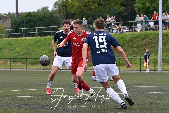 Fussball, Bezirksliga Ost, SG Malberg (rot) vs. SG Westerburg-Gemuenden-Willmenrod (schwarz-weiß) , 16.08.2025 |