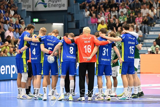 Vor den Anwurf versammeln sich die beiden Teams am Mittelkreis GER, VfL Gummersbach vs. Fuechse Berlin, Handball, Daikin 1. Bundesliga, 4. Spieltag, Spielzeit 2025-2026, Schwalbe Arena Gummersbach, 14.09.2025 Foto: Eibner-Pressefoto/Juergen Augst |