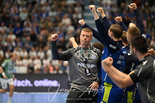Gudjon Valur Sigurdsson (VfL Gummersbach Trainer) und seine Bank jubeln GER, VfL Gummersbach vs. Fuechse Berlin, Handball, Daikin 1. Bundesliga, 4. Spieltag, Spielzeit 2025-2026, Schwalbe Arena Gummersbach, 14.09.2025 Foto: Eibner-Pressefoto/Juergen Augst |