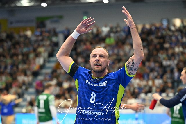 Lukas Blohme (VfL Gummersbach 8) triumpfiert GER, VfL Gummersbach vs. Fuechse Berlin, Handball, Daikin 1. Bundesliga, 4. Spieltag, Spielzeit 2025-2026, Schwalbe Arena Gummersbach, 14.09.2025 Foto: Eibner-Pressefoto/Juergen Augst |