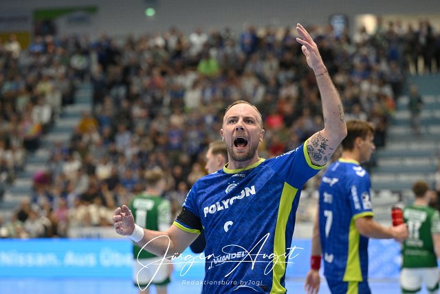Lukas Blohme (VfL Gummersbach 8) jubelt GER, VfL Gummersbach vs. Fuechse Berlin, Handball, Daikin 1. Bundesliga, 4. Spieltag, Spielzeit 2025-2026, Schwalbe Arena Gummersbach, 14.09.2025 Foto: Eibner-Pressefoto/Juergen Augst |