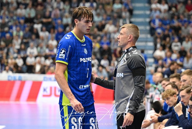 Gudjon Valur Sigurdsson (VfL Gummersbach Trainer) gibt Julian Koester (VfL Gummersbach 7) Anweisungen GER, VfL Gummersbach vs. Fuechse Berlin, Handball, Daikin 1. Bundesliga, 4. Spieltag, Spielzeit 2025-2026, Schwalbe Arena Gummersbach, 14.09.2025 Foto: Eibner-Pressefoto/Juergen Augst |