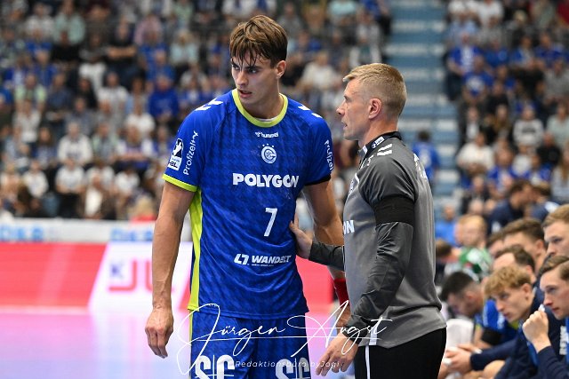Gudjon Valur Sigurdsson (VfL Gummersbach Trainer) instruiert Julian Koester (VfL Gummersbach 7) GER, VfL Gummersbach vs. Fuechse Berlin, Handball, Daikin 1. Bundesliga, 4. Spieltag, Spielzeit 2025-2026, Schwalbe Arena Gummersbach, 14.09.2025 Foto: Eibner-Pressefoto/Juergen Augst |