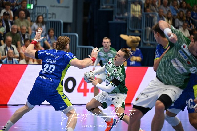Tobias Grondahl (Fuechse Berlin 15) ggegen Tom Kiesler (VfL Gummersbach 30) GER, VfL Gummersbach vs. Fuechse Berlin, Handball, Daikin 1. Bundesliga, 4. Spieltag, Spielzeit 2025-2026, Schwalbe Arena Gummersbach, 14.09.2025 Foto: Eibner-Pressefoto/Juergen Augst |