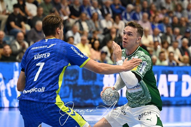Lasse Bredekjaer Andersson (Fuechse Berlin 11) gegen Julian Koester (VfL Gummersbach 7) GER, VfL Gummersbach vs. Fuechse Berlin, Handball, Daikin 1. Bundesliga, 4. Spieltag, Spielzeit 2025-2026, Schwalbe Arena Gummersbach, 14.09.2025 Foto: Eibner-Pressefoto/Juergen Augst |