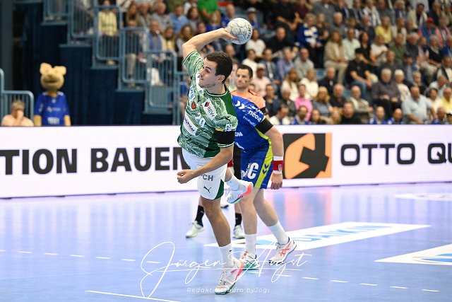 Tim Freihoefer (Fuechse Berlin 20) beim 7 Meter Strafwurf GER, VfL Gummersbach vs. Fuechse Berlin, Handball, Daikin 1. Bundesliga, 4. Spieltag, Spielzeit 2025-2026, Schwalbe Arena Gummersbach, 14.09.2025 Foto: Eibner-Pressefoto/Juergen Augst |