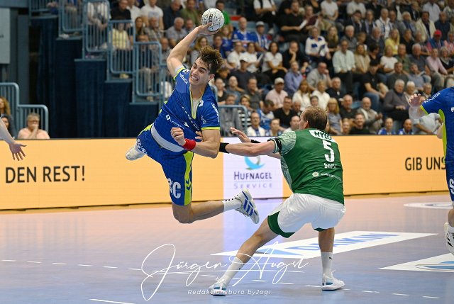 Julian Koester (VfL Gummersbach 7) gegen Max Darj (Fuechse Berlin 5) GER, VfL Gummersbach vs. Fuechse Berlin, Handball, Daikin 1. Bundesliga, 4. Spieltag, Spielzeit 2025-2026, Schwalbe Arena Gummersbach, 14.09.2025 Foto: Eibner-Pressefoto/Juergen Augst |