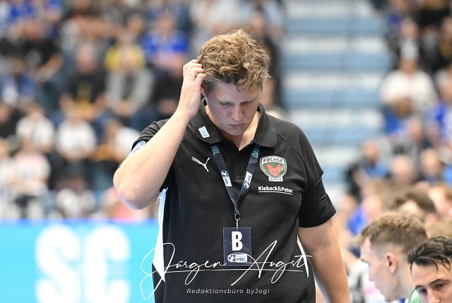 Nicolej Krickau (Fuechse Berlin Trainer) kratzt sich am Kopf GER, VfL Gummersbach vs. Fuechse Berlin, Handball, Daikin 1. Bundesliga, 4. Spieltag, Spielzeit 2025-2026, Schwalbe Arena Gummersbach, 14.09.2025 Foto: Eibner-Pressefoto/Juergen Augst |