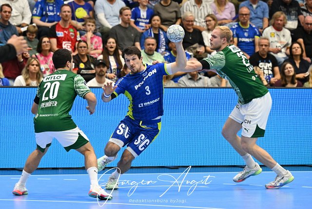 #3 Joao Gomes (VfL Gummersbach 3) gegen Tim Freihoefer (Fuechse Berlin 20) und Matthes Langhoff (Fuechse Berlin 25) GER, VfL Gummersbach vs. Fuechse Berlin, Handball, Daikin 1. Bundesliga, 4. Spieltag, Spielzeit 2025-2026, Schwalbe Arena Gummersbach, 14.09.2025 Foto: Eibner-Pressefoto/Juergen Augst |