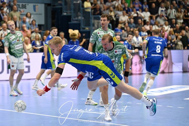 Ellidi Vidarsson (VfL Gummersbach 4) gegen Max Darj (Fuechse Berlin 5) GER, VfL Gummersbach vs. Fuechse Berlin, Handball, Daikin 1. Bundesliga, 4. Spieltag, Spielzeit 2025-2026, Schwalbe Arena Gummersbach, 14.09.2025 Foto: Eibner-Pressefoto/Juergen Augst |