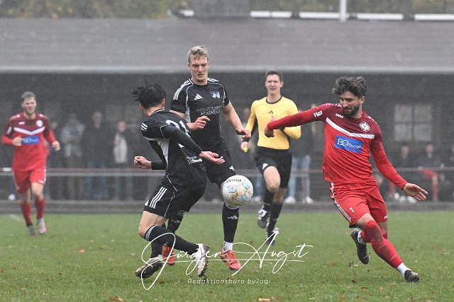 Fussball, Bezirksliga Ost, SG Lautzert-Oberdreis-Berod-Wahlrod (rot) vs. SG Hundsangen (schwarz), 09.11.2025 | ||