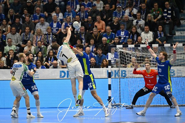 Felix Claar (SC Magdeburg 7) gegen Julian Koester (VfL Gummersbach 7) VfL Gummersbach vs. SC Magdeburg, Handball, Daikin 1. Bundesliga, 17. Spieltag, Spielzeit 2025-2026, Schwalbe Arena Gummersbach, 14.12.2025 Foto: Eibner-Pressefoto/Juergen Augst | ||