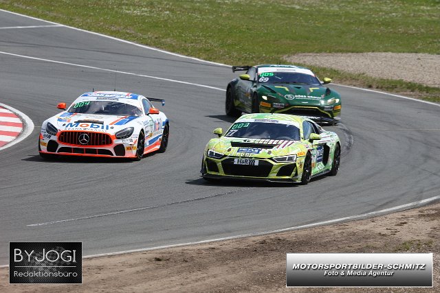 #77 Jan Philipp Springob (DEU) / John Paul Southern (USA), Audi R8 LMS GT4, Team: T3 Motorsport (DEU), #13 Jan Marschalkowski (DEU) / Theo Nouet (FRA), Mercedes-AMG GT4, Team: Zakspeed (DEU), #69 Phil Dörr (DEU) / Andreas Wirth (DEU), Aston Martin Vantage GT4, Team: Dörr Motorsport (DEU), ADAC GT4 Germany, Motorsport Arena Oschersleben, Rennen 1, 15.05.2021 | ||