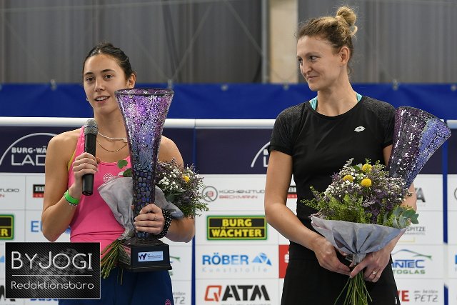 Siegespodest Doppel der Burg-Wächter Ladies Open 2022 mit den Gewinnerinnen Mariam Bolkvadze (GEO/li) und Samantha Murray Sharan (GBR/re), Mariam Bolkvadze (GEO/li) und Samantha Murray Sharan (GBR/re), Burg-Waechter Ladies Open 2022, Altenkirchen, Doppelfinale, Bandecchi/Waltert vs Bolkvadze/Sharan - Foto: Augst/Eibner-Pressefoto | ||