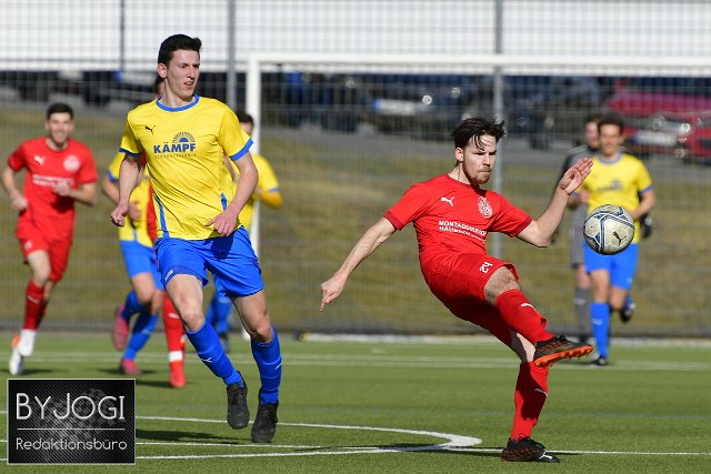 Fussball, Bezirksliga Ost, SG Weitefeld-Langenbach (rot) vs. SG Mueschenbach-Hachenburg (gelb/blau), 13.03.2022 | ||