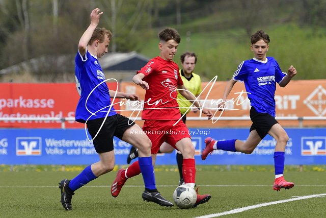 Fussball, Rheinlandpokal Viertelfinale, C-Junioren, JSG Neitersen-Altenkiirchen (rot) vs. Spfr. Eisbachtal (blau/schwarz), 23.04.2022 | ||