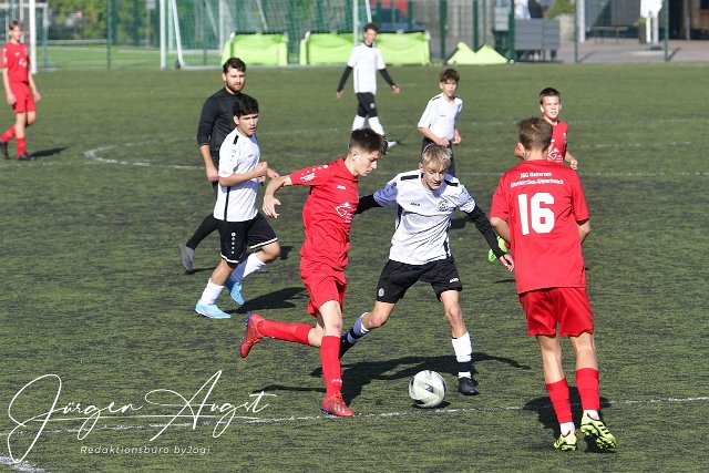 Fussball, Rheinlandliga, C-Junioren, JSG Weyerbusch (weiß/schwarz) vs. SSV Heimbach-Weis (rot), 08.10.2022 | ||