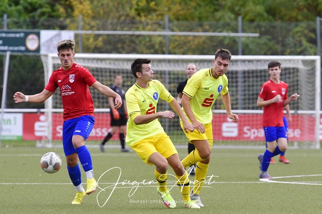 Fussball, Rheinlandliga, SG Altenkirchen-Neitersen (rot-blau) vs. FC Metternich (gelb), 23.10.2022 | ||